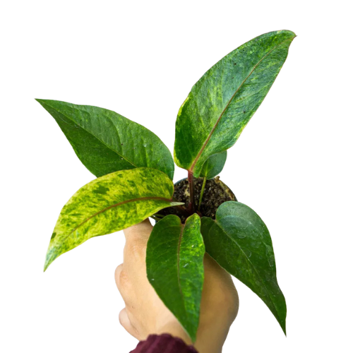 The Anthurium Renaissance Variegated is a rare and premium collector plant admired for its dramatic cream, yellow, and green variegation across bold tropical foliage. Each leaf showcases unique marbling patterns, making every plant one-of-a-kind and highly desirable among enthusiasts.